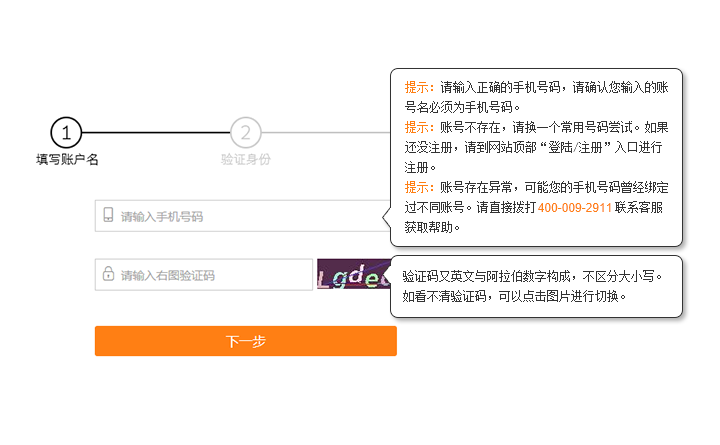第一步:填写账户名。进入 忘记密码 页面,输入所需要找回的帐号,填写验证码,点击“下一步”: